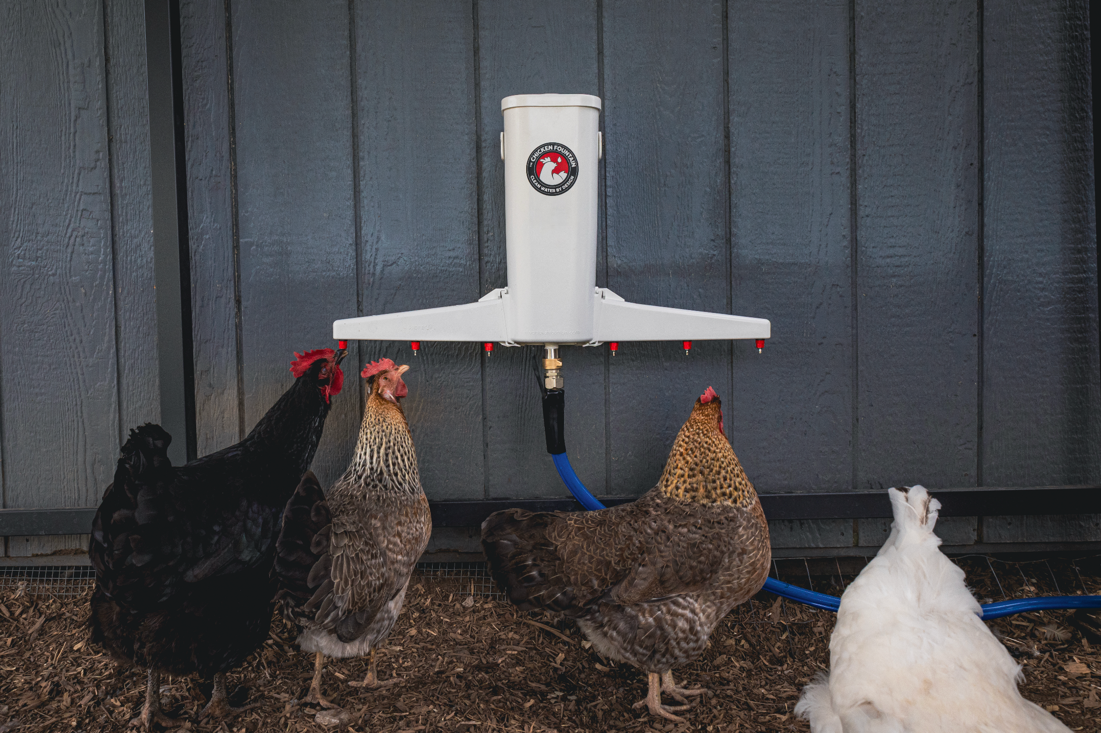 We designed The Chicken Fountain™ because we were tired of scrubbing dirty water bowls twice a day — and watching our birds drink from filthy water anyway.